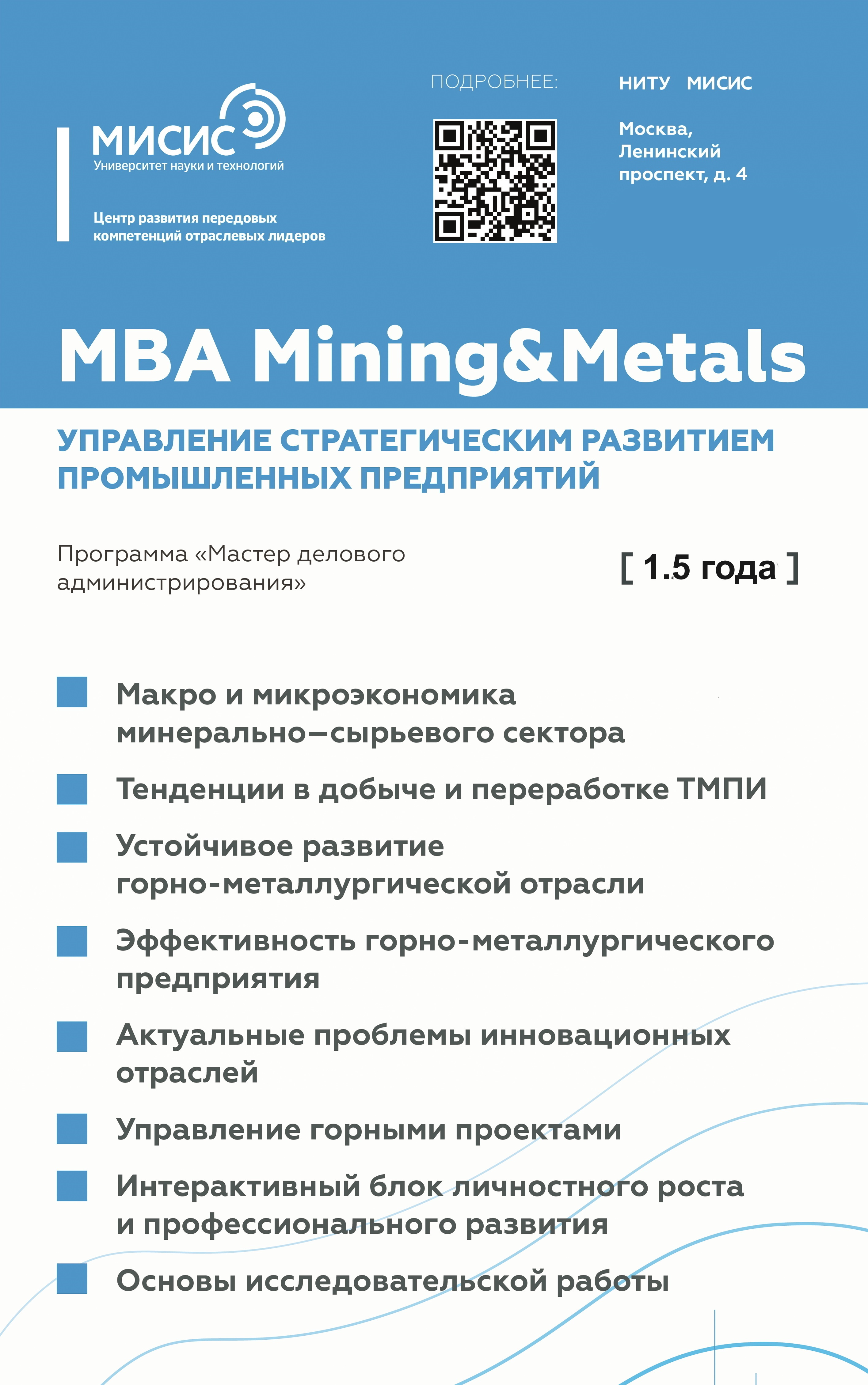 Ведущая школа бизнеса в России объединила передовой опыт в области горного дела и металлургии, лучшие управленческие навыки, инновационные технологии, глубинные экспертные знания и самые востребованные практики для того, чтобы создать актуальные и уникальные программы MBA (Мастер делового администрирования) и DBA (Доктор делового администрирования).
