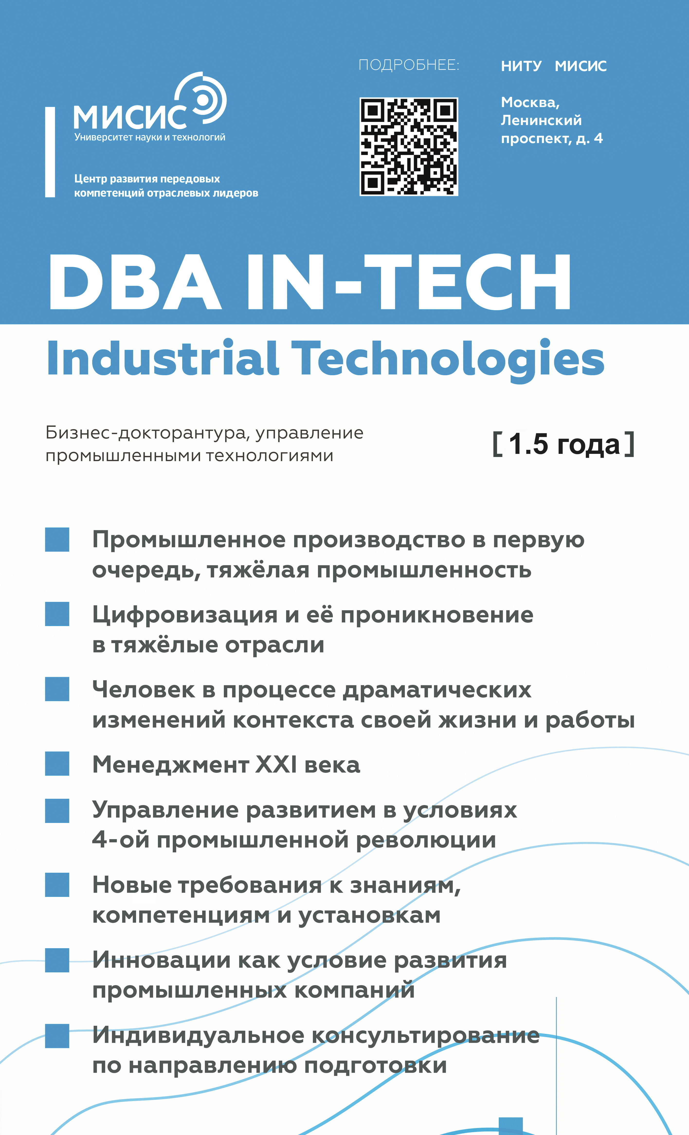 - DBA «Industrial Technologies» (InTech) — программа «Доктор администрирования промышленными технологиями». Для руководителей высшего управленческого звена, владельцев компаний и государственных чиновников из тяжёлых отраслей промышленности.